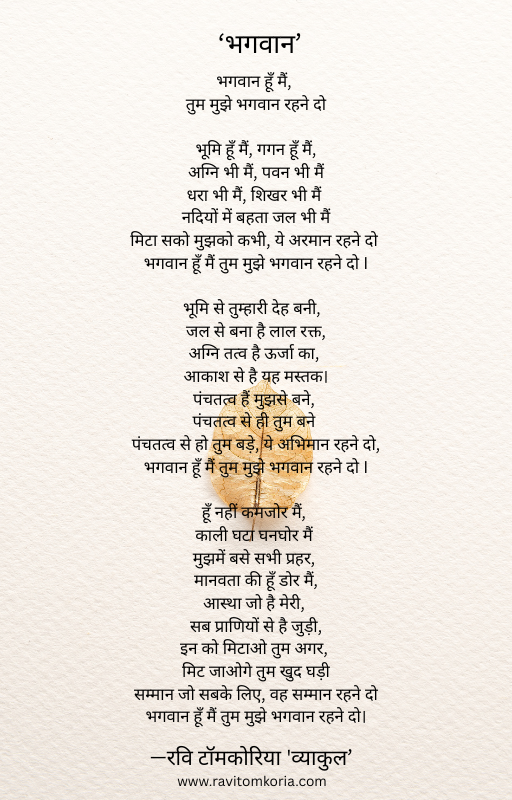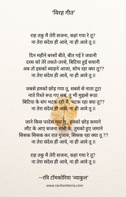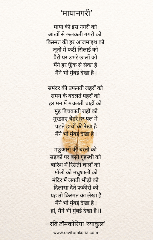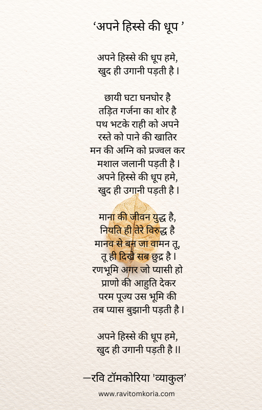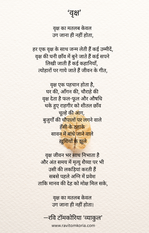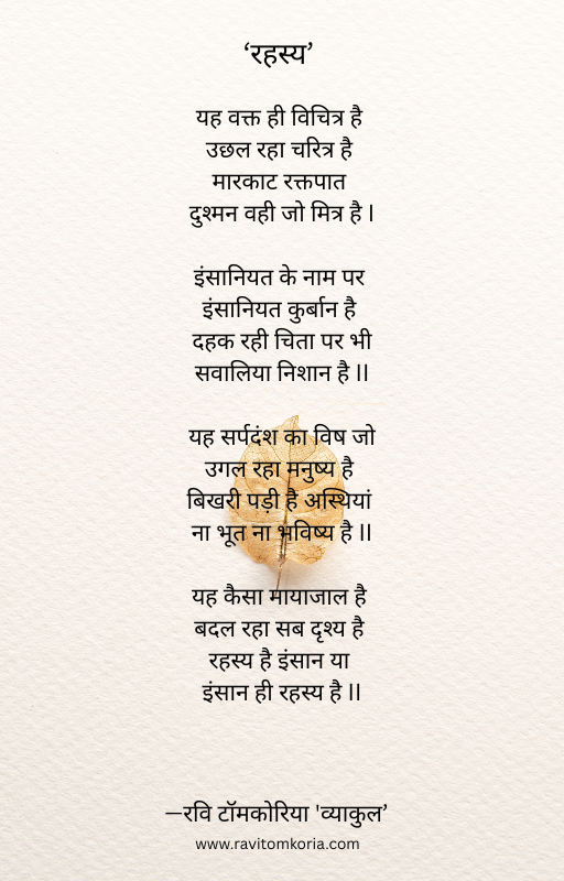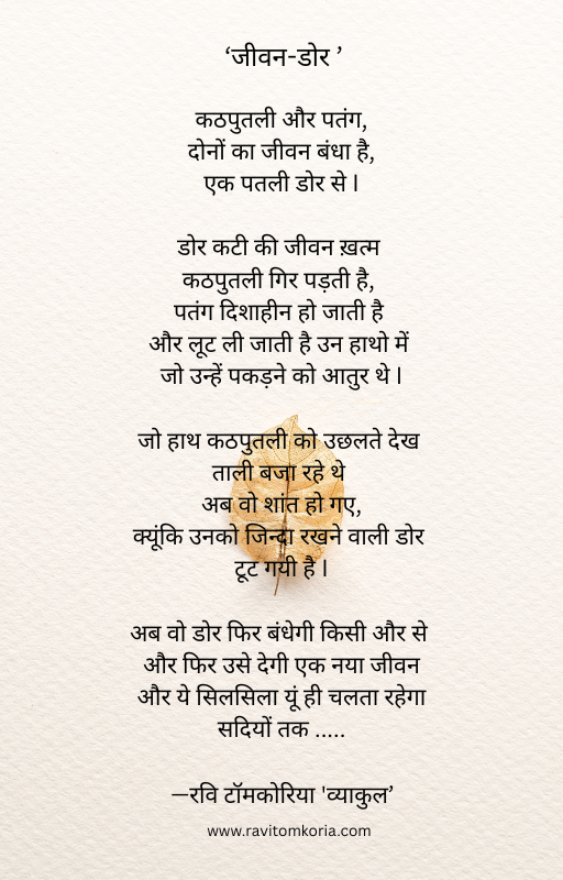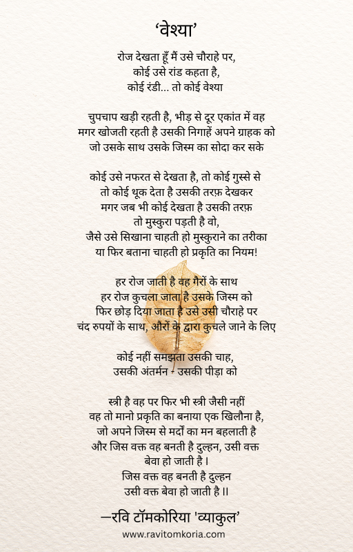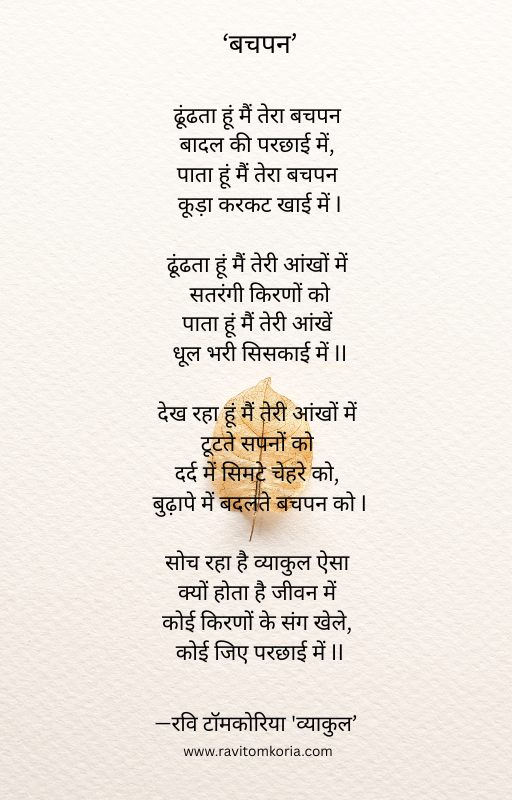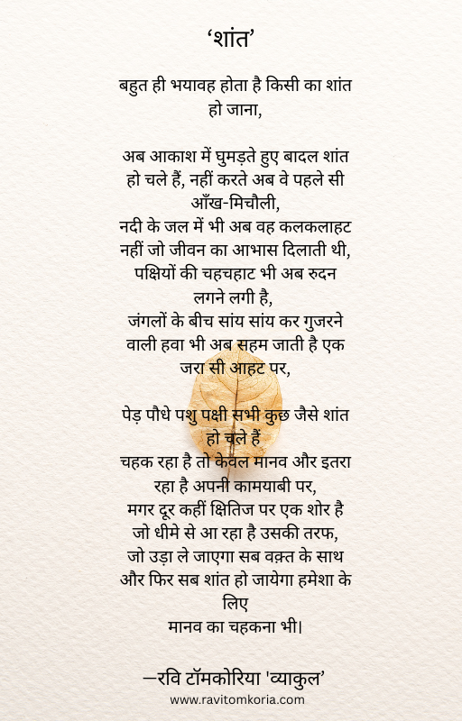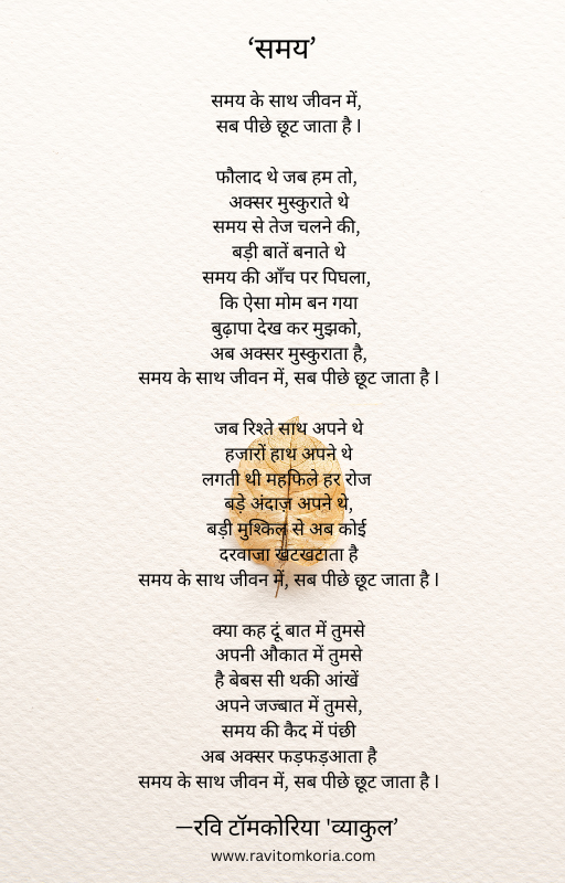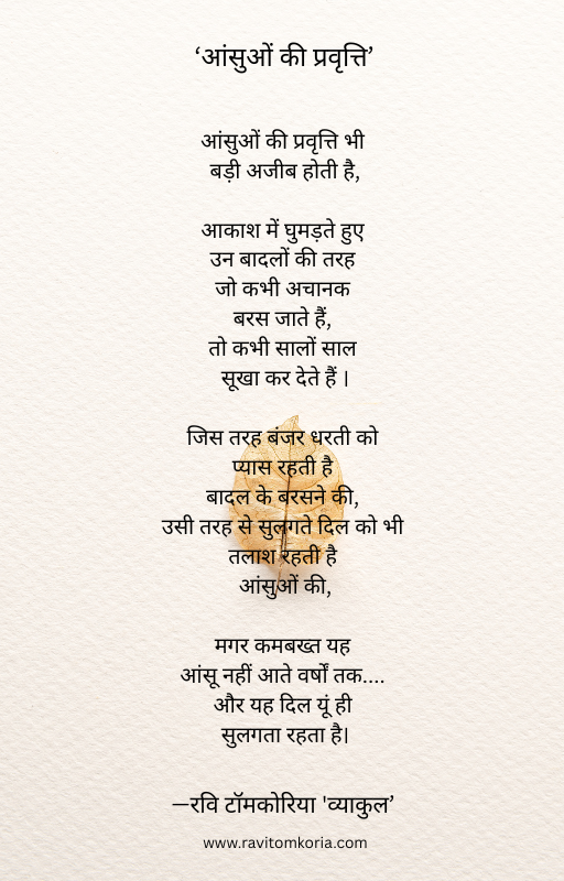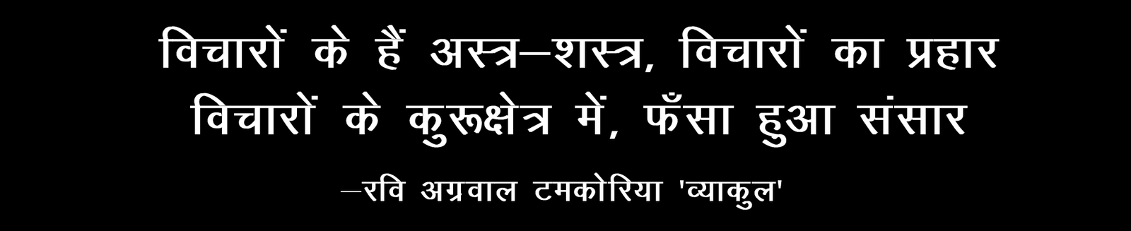 रवि टमकोरिया हिंदी भाषा के कवि और रचनाकार है जो अपने उपनाम ‘व्याकुल’ के नाम से अपने विचारों को कविता एवं कहानी के रूप में प्रस्तुत करते आ रहे हैं। व्याकुल को कविता लेखन की प्रेरणा अपने पिता श्री राजकुमार टमकोरिया से मिली जो खुद भी एक रचनाकार थे और उन्होंने अपने उपनाम राजकुमार ‘अकेला’ के नाम से कई रचनायें लिखी। ‘व्याकुल’ की रचनाओं में देश-प्रेम, सामाजिक चेतना एवं मानव मूल्यों का समावेश दिखाई पड़ता है। कवि का विचार है की मनुष्य ने भौतिक एवं वैज्ञानिक क्षेत्र में तो प्रगति कर ली है परन्तु उसकी आद्यत्मिक प्रगति रुक गयी है। कवि मुंबई स्थित “फ़िल्म राइटर्स एसोसिएशन” के सदस्य है और लेखन के क्षेत्र में लगातार कार्य कर रहे हैं। इनकी कई रचनाओं को प्रतिष्ठित मंच से सम्मानित किया जा चूका है, जिनमे हिन्द युग्म प्रकाशन, साहित्य २४ आदि कुछ उल्लेखनीय नाम है। (SWA Membership No. – 32548)